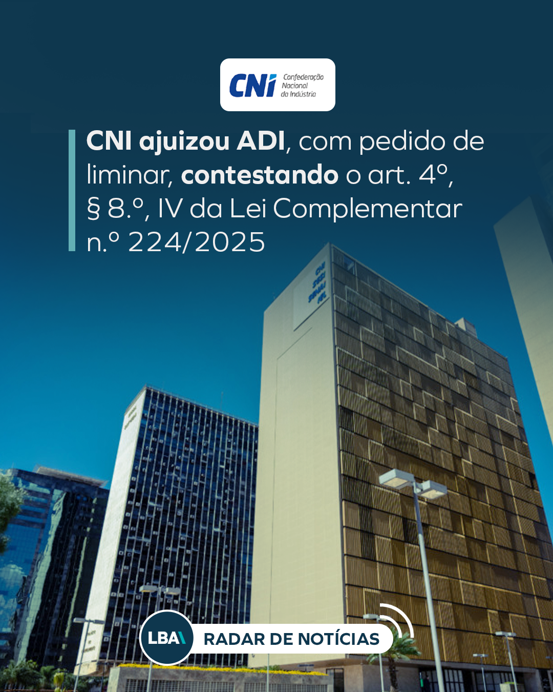 A Confederação Nacional da Indústria (CNI) protocolou no Supremo Tribunal Federal (STF) uma Ação Direta de Inconstitucionalidade (ADI) com pedido de medida cautelar para questionar dispositivos da Lei Complementar nº 224/2025, que tratam da redução de incentivos e benefícios fiscais de natureza tributária.